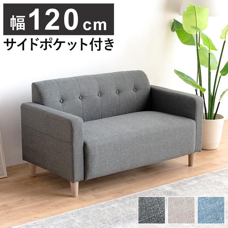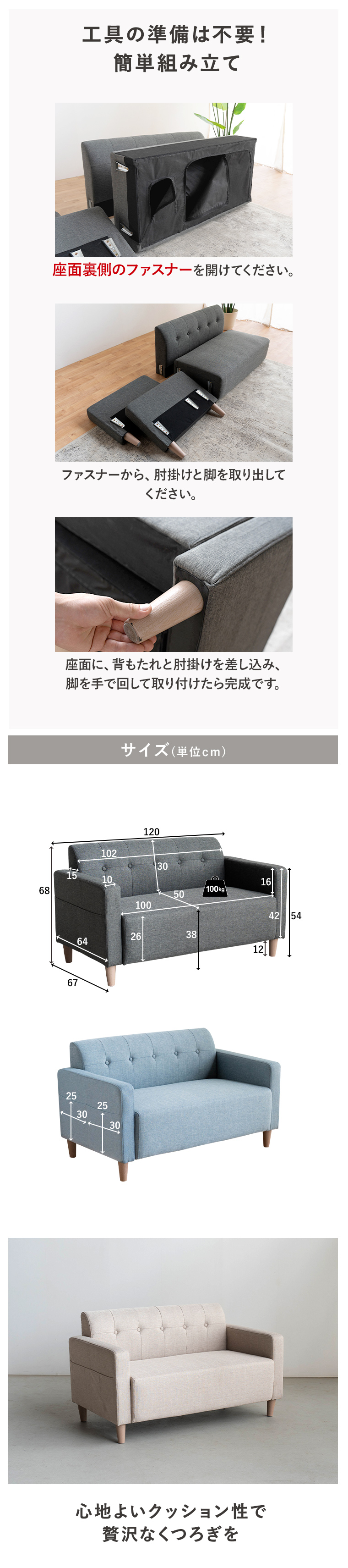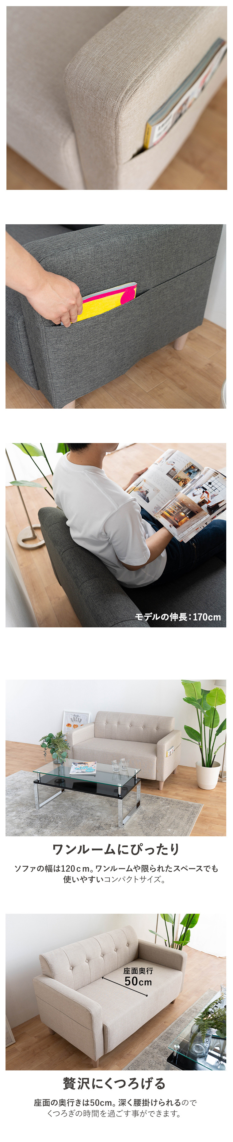 | ・2人掛けソファ。 ・コンパクトなので、ワンルームなど限られたスペースにおすすめです。 ・肘置きの両サイドに収納ポケット付き。(計4個) ・雑誌やリモコン等さっと収納することができます。 ・厚みのある座面なので、ゆったりとリラックスすることができます。 ・ファブリックのさらりとした触り心地。季節を問わず快適に過ごすことができます。 ・ソファ背面も同じ張地できれいに仕上げています。 ・簡単に組み立てる事ができます。 ・樹脂製の脚は、木目デザイン。 ・肘掛けと脚は、座面裏のファスナー内に収納した状態でお届けします。 ・組み立ての際は、座面裏のファスナーから部品を取り出してください。 | |
