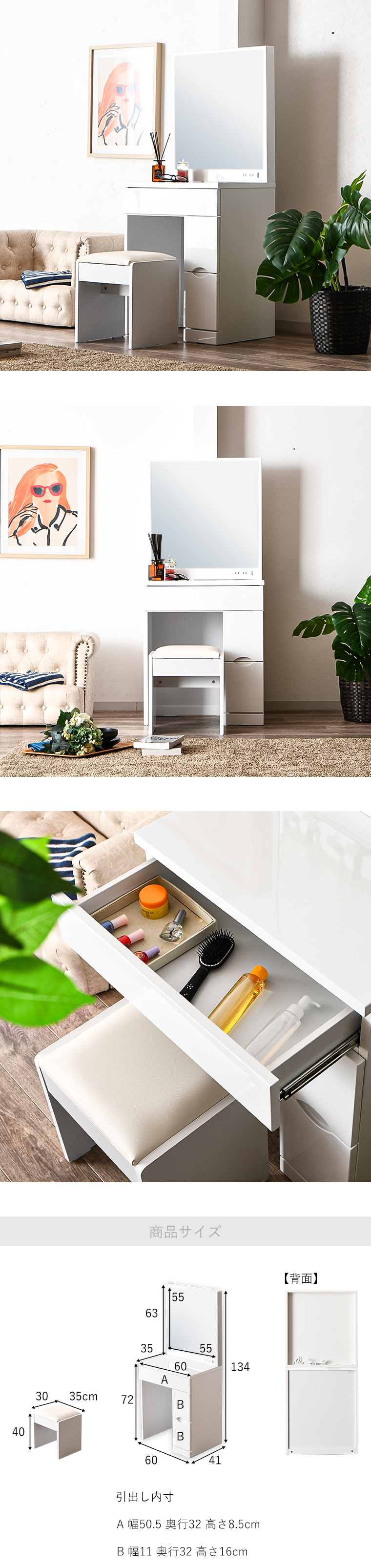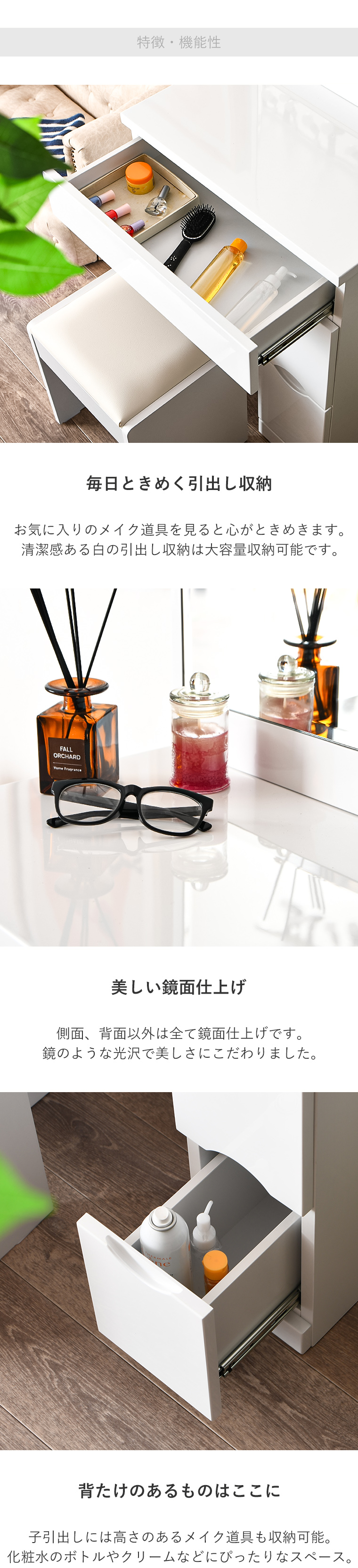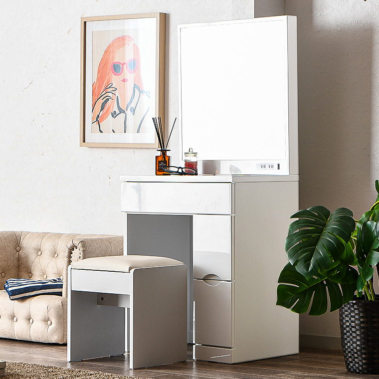 | ・毎日使うものだから、より使いやすく… ・幅60cmドレッサー ・収納力抜群でお部屋がスッキリ ・色々な収納を備えた本格派ドレッサー ・エナメル塗装仕上げで光沢があり高級感があります ・お部屋を雰囲気を変えてくれます ・鏡面仕上げで清潔感がありお部屋が映えます ・一人暮らしの方やアパートの方などにもすんなりと置くことができるサイズで圧迫感がありません ・引き出しはスライドレール付きで化粧品などらくらく取り出しできます ・違った収納サイズの引き出しで用途に合わせて収納できます | |