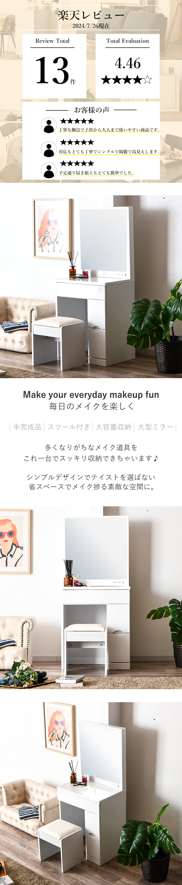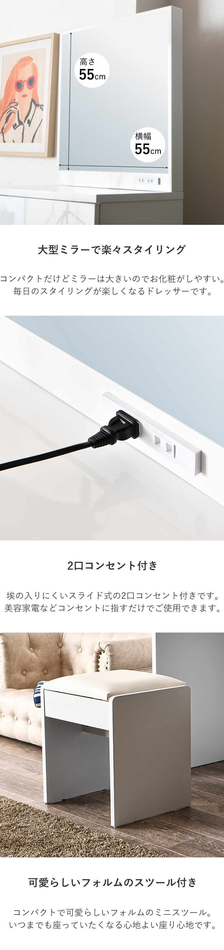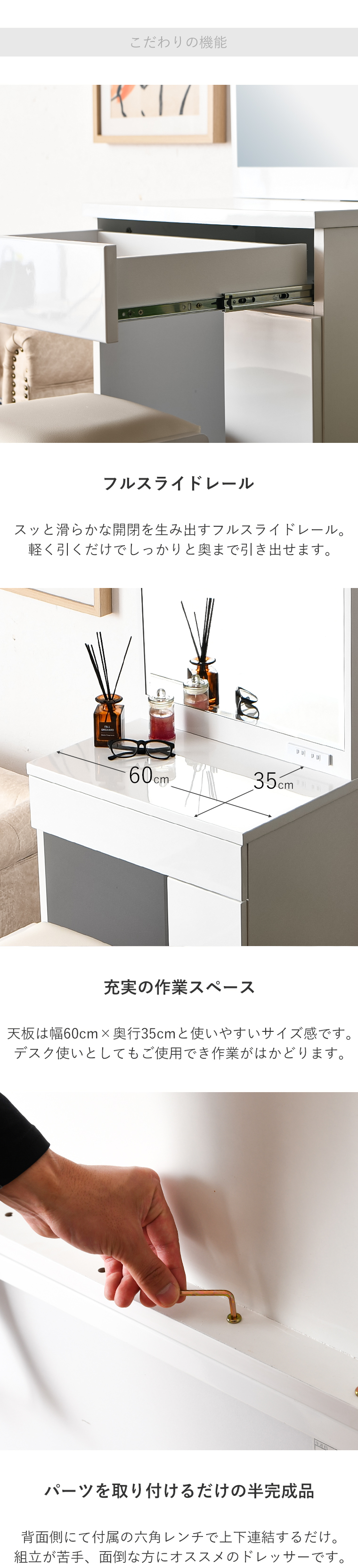 | ・毎日使うものだから、より使いやすく… ・幅60cmドレッサー ・収納力抜群でお部屋がスッキリ ・色々な収納を備えた本格派ドレッサー ・エナメル塗装仕上げで光沢があり高級感があります ・お部屋を雰囲気を変えてくれます ・鏡面仕上げで清潔感がありお部屋が映えます ・一人暮らしの方やアパートの方などにもすんなりと置くことができるサイズで圧迫感がありません ・引き出しはスライドレール付きで化粧品などらくらく取り出しできます ・違った収納サイズの引き出しで用途に合わせて収納できます | |
