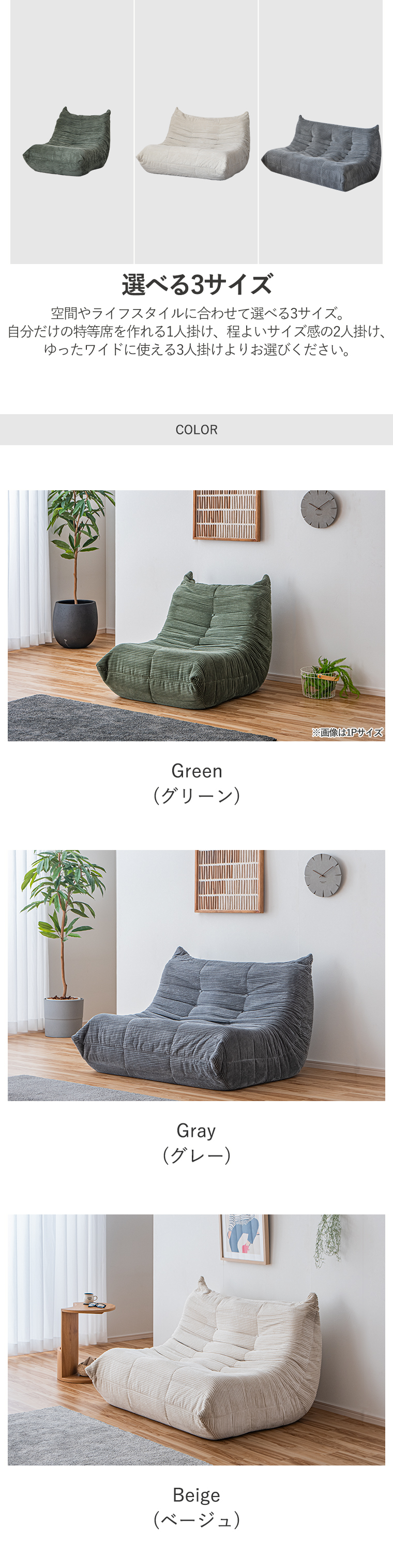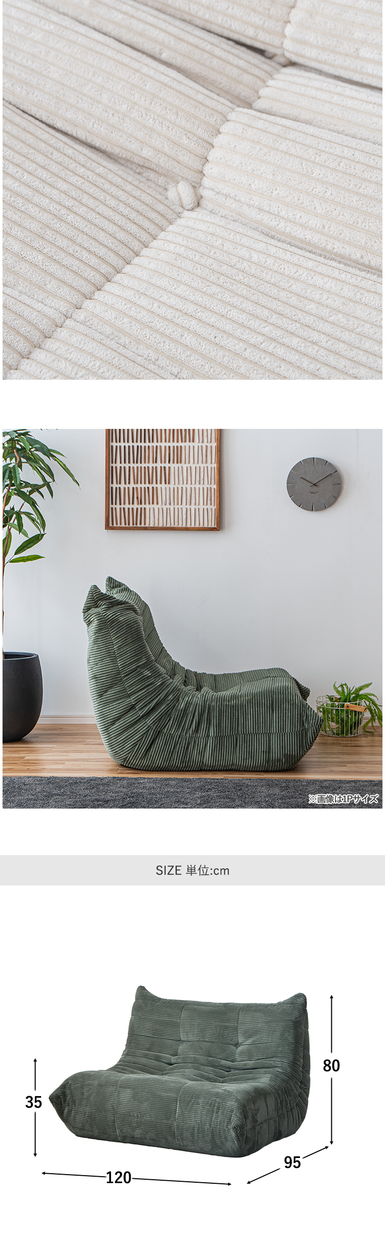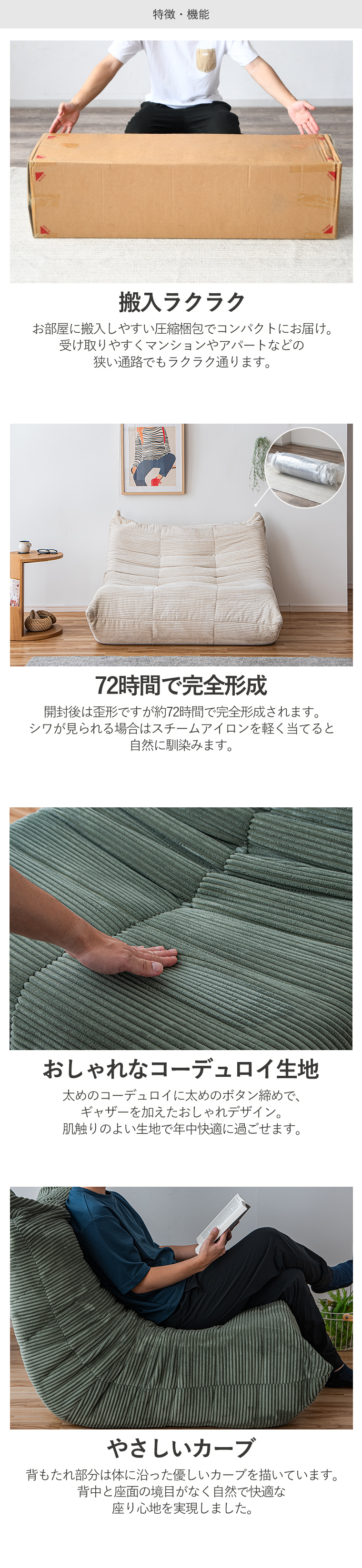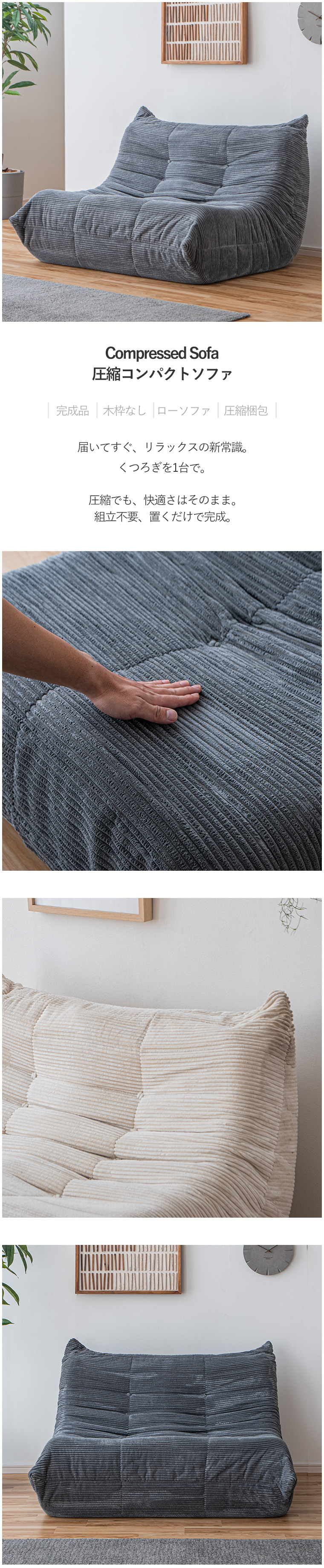 | ・ワンルームにおすすめコンパクト2Pソファ ・ローソファ ・幅120cmで一人暮らしのワンルームにも置きやすく、1〜2人まで座れるコンパクトサイズ ・コーデュロイの上品さと大人な雰囲気の3色のカラーが融合したおしゃれなデザイン ・中身はウレタンのみを使用しているので軽量で伸縮性に優れています ・背面もきれいな仕上がりで、リビング中央の設置することも可能です ・リラックスしやすい ・長時間座っていても疲れにくい ・あっという間に広がる圧縮梱包 ・圧縮梱包でコンパクトに ・真空圧縮梱包でお届けまでの劣化を防ぎます ・床面の素材は滑りにくくので、ズレにくい仕様です | |