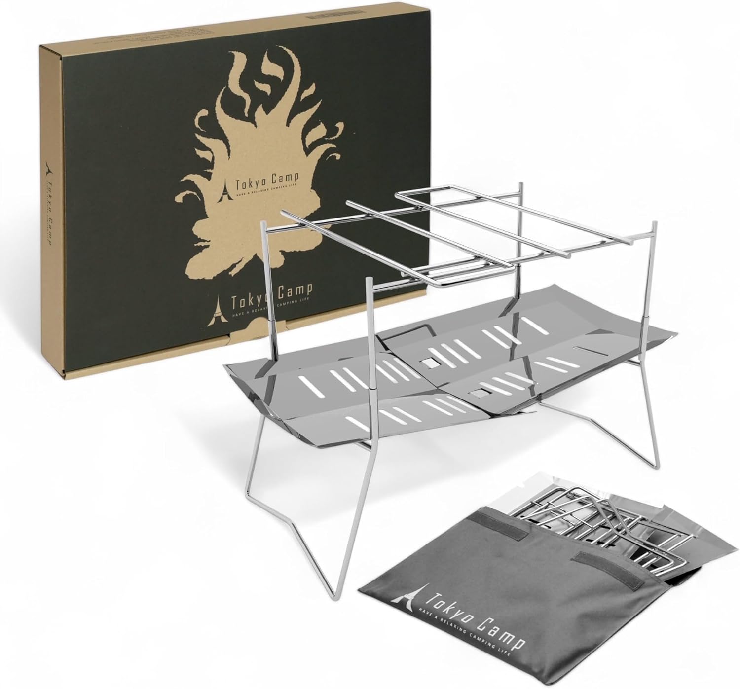・ TokyoCamp 焚き火台 シンプルでコンパクトなデザインが特徴のTokyoCampが誇る焚き火台。折り畳み可能で、誰にでも15秒程度で簡単に組み立て、ができます。コンパクトな折りたたみ式焚き火台にも関わらず、大きな薪を割らずに入れられる包容力も魅力。また、調理道具を使った焚き火飯やBBQ等マルチに活躍する焚き火台です。収納バッグも付き、ほぼA4サイズに収まるので持ち運びも楽々。