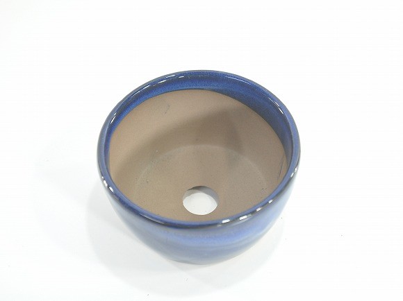 釉薬が全体に塗られているので、ツルツルしていて木や植物の花が映り込むでしょう。 【盆栽鉢】生子 丸 切立 3号 青