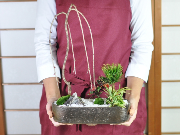 横長の和モダンな鉢に松竹梅と枝垂れ桜を贅沢に植え込みました。