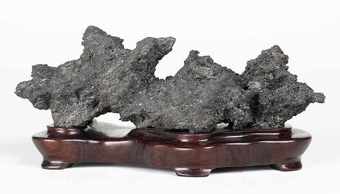 墨黒の色合いに細かなジャグレが味わい深い。激しい波打ち際の情景を彷彿させる、変化に飛んだ形状が面白い一石。見付けの巧みさや台座の丁寧な作りがこの石の世界観を存分に引き出しています。