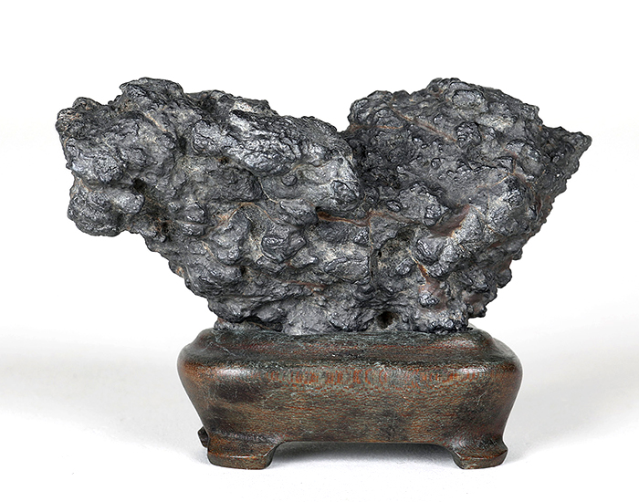 玄海石は北九州市若松区小石海岸西方に広く産する?石の代表格です。玄海石の特徴の一つ窪みのある真黒石で持ち込みの古さが味わい深い逸品です。玄海灘の荒波に研磨された海ずれの石肌が雷雲のごとき迫力を表現し、大自然の厳しさを感じさせる。底は大きく手を入れた痕跡はなく、ウブに近い状態です。