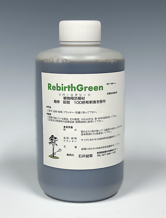 リバースグリーンは主要成分「カメリア菌」により、樹木の根を活性化して樹木全体を健全にする活根肥料です。盆栽はもとより、庭木・山野草・蘭・野菜・芝などの樹勢回復や衰弱に最適です。悪臭がなく、人畜無害なので安心して使えます。