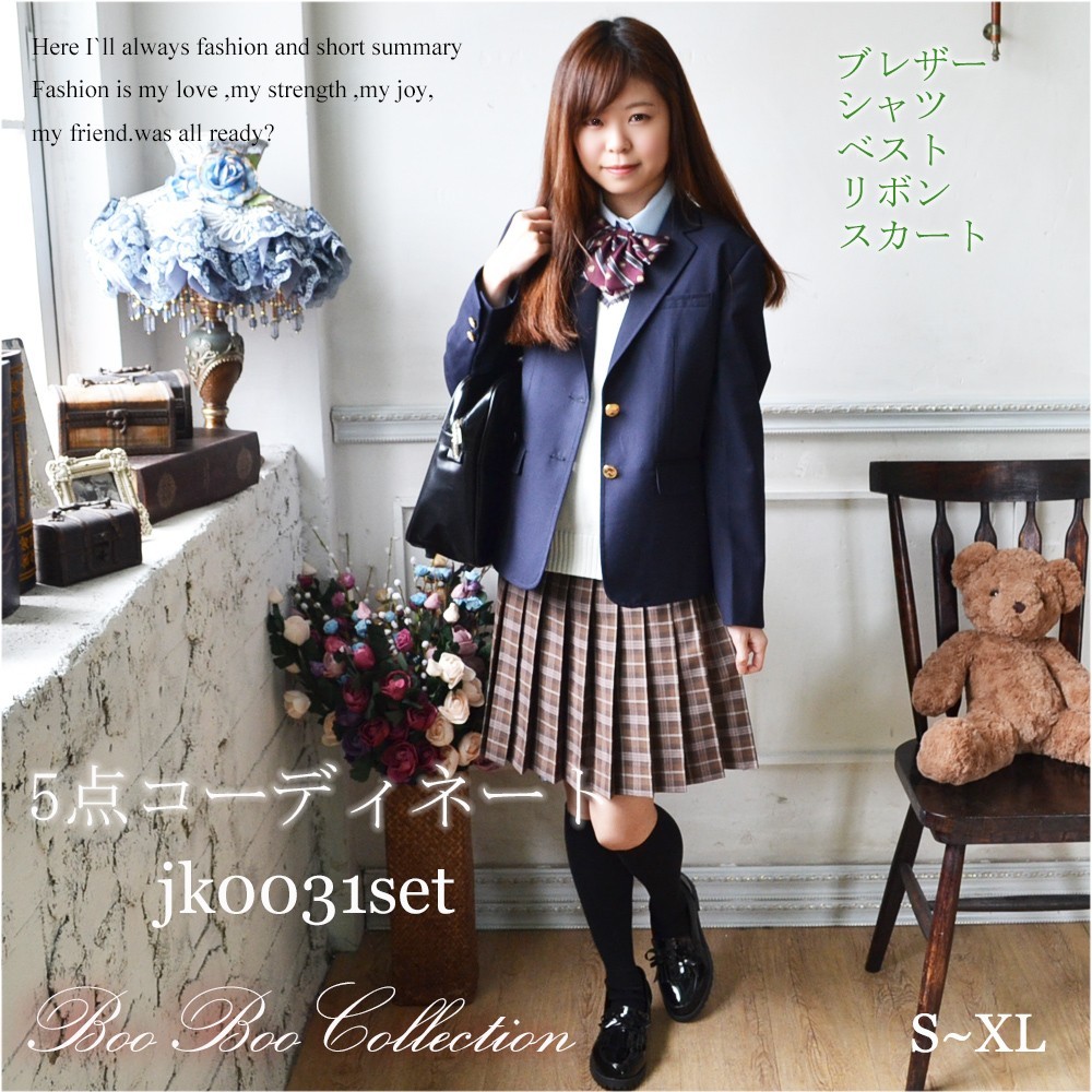 スクールブレザー込み5点セット (ブレザー・シャツ・リボン・ベスト・スカート) 制服 女子高生 通学 学生 中学 紺 ネイビー