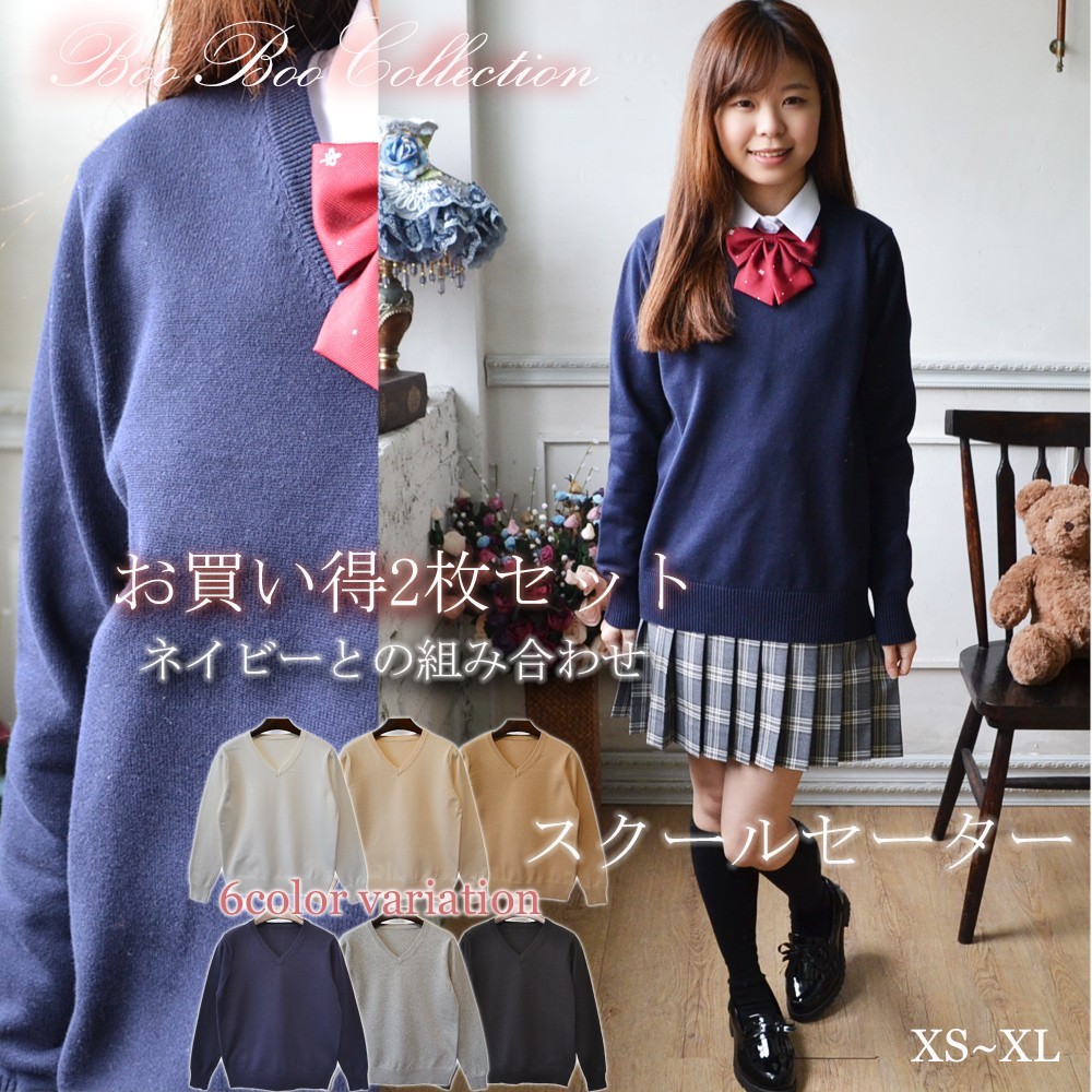 スクールセーター2着セット 正統派 学制服 女子高生 通学 学生 中学 Vネック 無地 定番