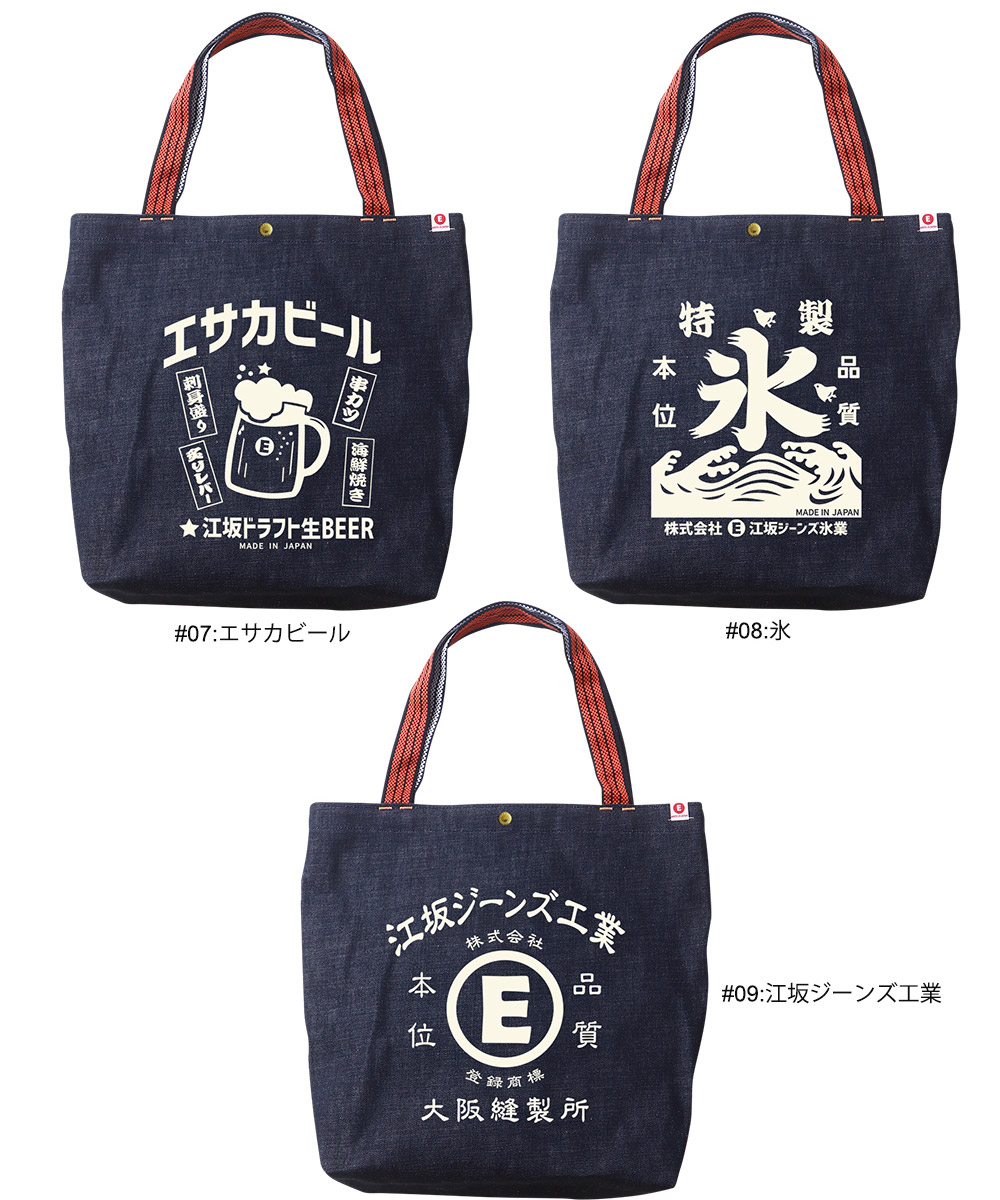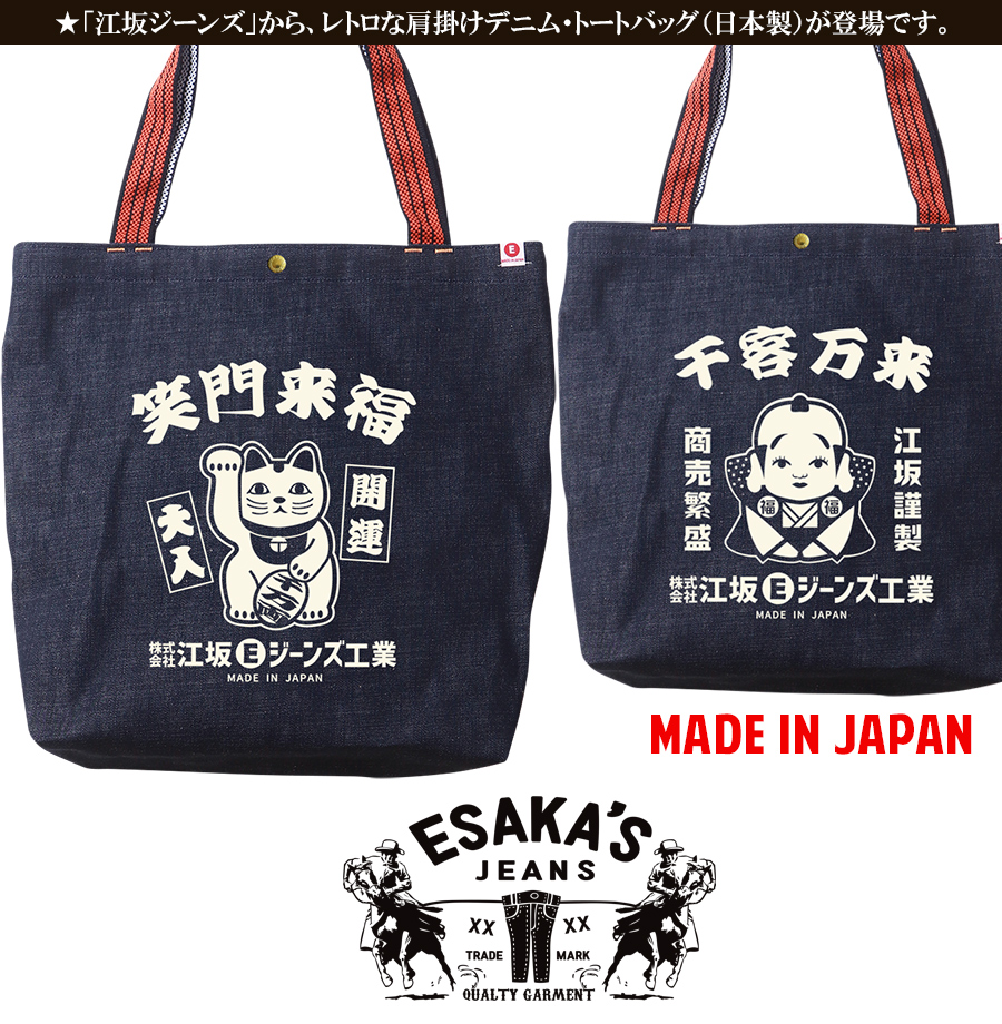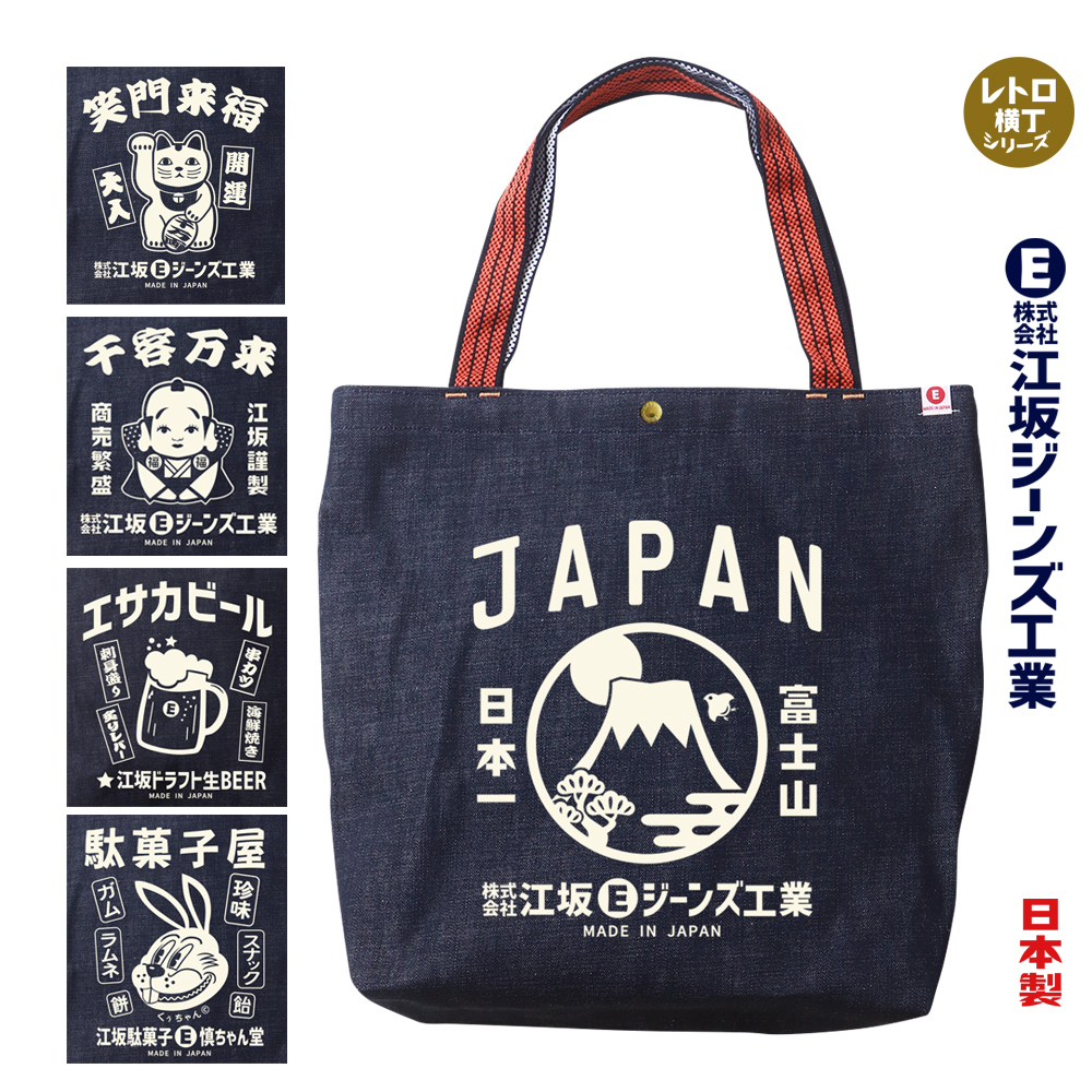 江坂ジーンズ・オレンジ取手「レトロ横丁」デニム肩掛トートバッグ 日本製 昭和レトロ made in Japan
