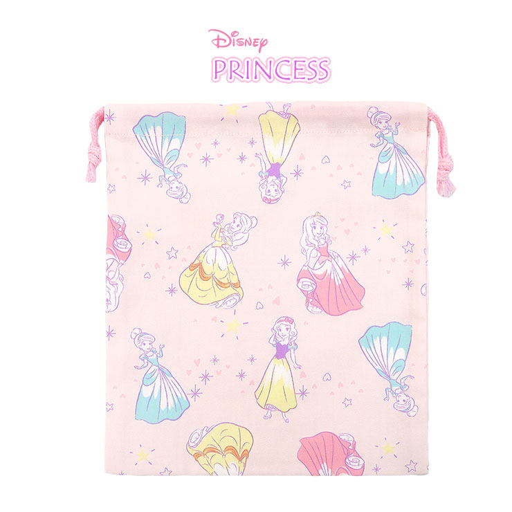 淡いピンクをベースに、白雪姫、シンデレラ、ベル、オーロラ姫がプリントされた可愛いミニ巾着袋です。給食袋、コップやナフキン入れなどで活躍すること間違いなしのサイズ感!ご入園やご入学の準備におすすめです。
