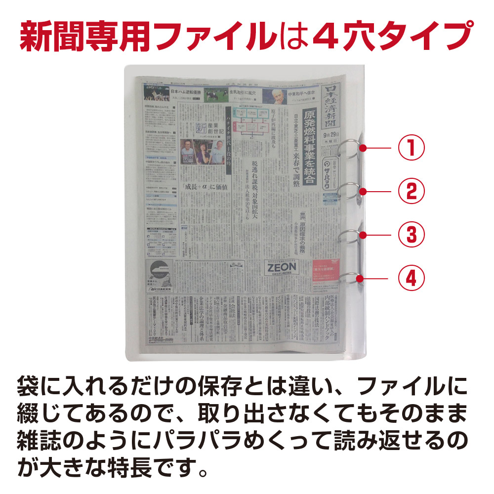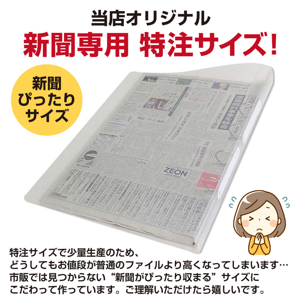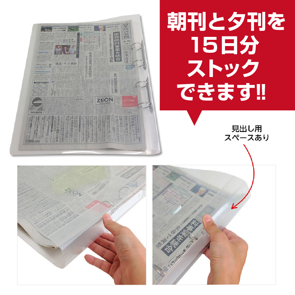 | 新聞の整理に! 朝・夕刊を15日分ストックできます。透明ポリプロピレン材使用で軽く、持ち運びや保管に便利です。 ワンタッチ機能なので読むのに楽&整理も簡単! 4か所で綴じるため新聞がばらつきません。新聞の折り目に中心を合わせて別売りの4穴同時パンチで穴をあけるだけ。 【下記の用途として】 新聞用ファイルとして、大型資料の整理用として、アーカイブ用、保存用、閲覧用、新聞整理、資料保存用に。 |
