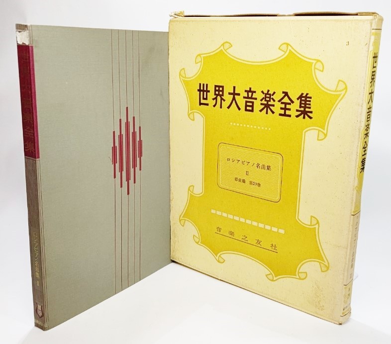 ・函/やけ、シミあり、底の破れあり。表紙/背の上部表面に1cm四方の四角い剥がれあり。本体/天地小口にシミ、やけあり。本文/60〜64Pの天に沿った上部余白に破れ破損あり、楽譜への影響はありません。その他は良好な状態です。
