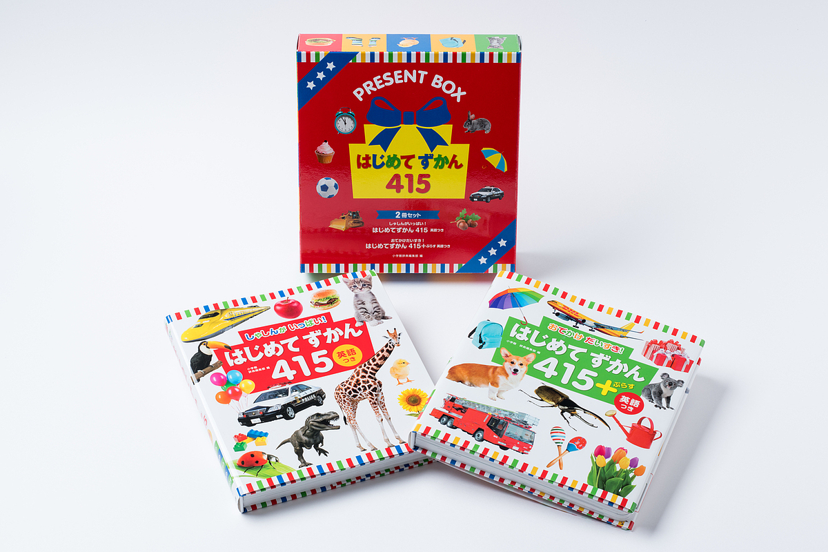 『しゃしんがいっぱい!はじめてずかん415』と『おでかけだいすき!はじめてずかん415+ぷらす』の2冊がセットになりました。収録語数はあわせて819語。すべての単語は、スマホやPCで日本語と英語の音声が聴けます。かわいいボックス入りでプレゼントにピッタリです。