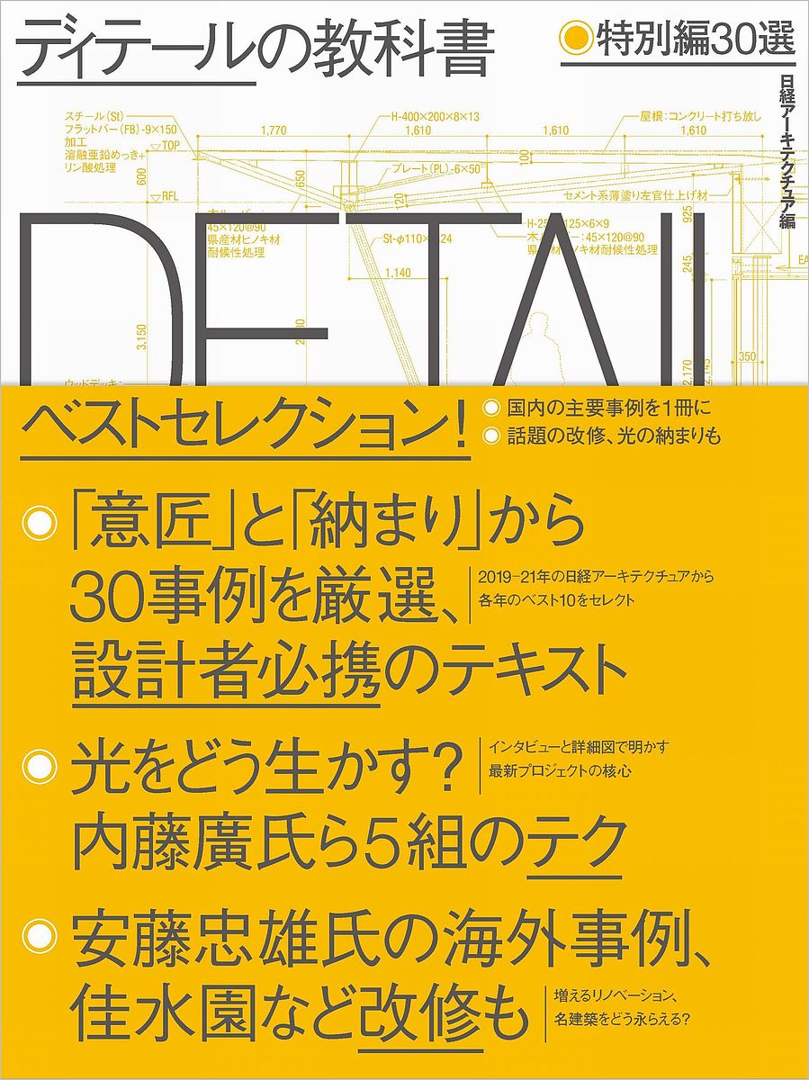 「意匠」と「納まり」から30事例を厳選、設計者必携のテキスト。光をどう生かす?内藤廣氏ら5組のテク。安藤忠雄氏の海外事例、佳水園など改修も。