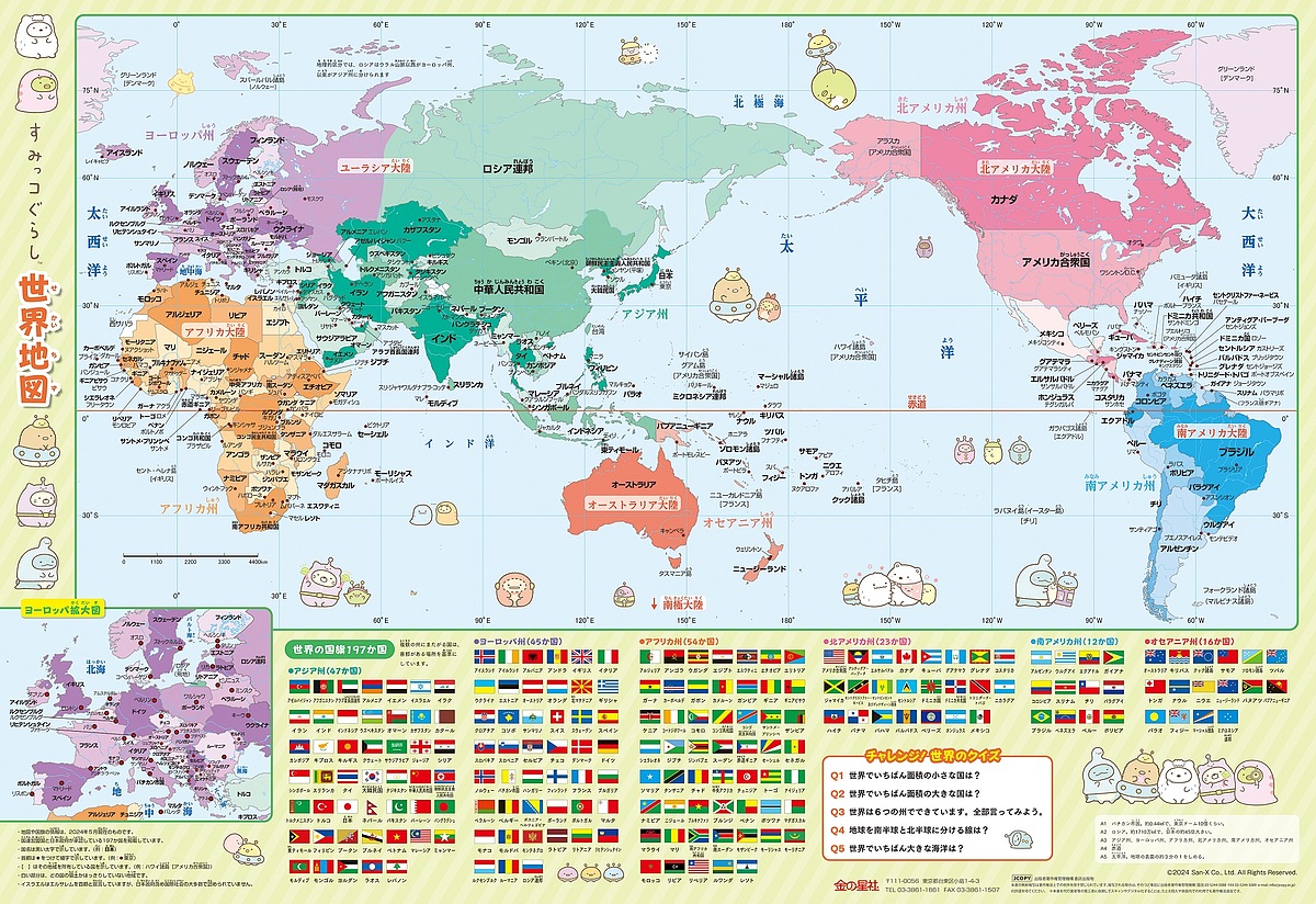 大人気キャラクター「すみっコぐらし」で楽しく学べるウォールチャートに「世界地図」が登場。おなじみのすみっコぐらしたちと、国やヨーロッパ州・アジア州など州の名前や位置を学びます。197か国の国旗も掲載。