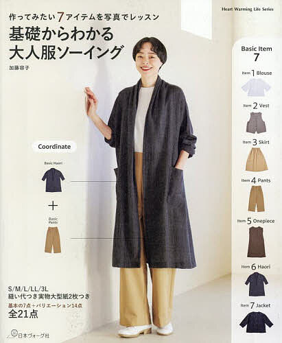 通年活躍する定番、スカート、ワンピース、パンツ、ブラウス、ベスト、はおり、ジャケットの7つのアイテムをすべて見やすい写真のプロセスで紹介し、身につけたいソーイングの基本やテクニックを学べる役立つ1冊。袖の付け方、ポケットの付け方、衿ぐり、裾の始末、カーブ部分のきれいな付け方などが洋裁の基礎が詳しくわかります。さらに各7アイテムに2つずつのアレンジ作品も含めて全21点を掲載。S/M/L/LL/3Lの5サイズ展開で縫い代つき型紙2枚つき。