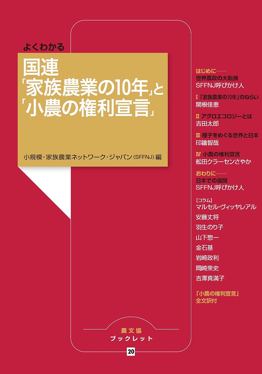 2018年12月の国連総会で「小農の権利宣言」が採択され、2019年から「家族農業の10年」がスタートする。本書は(1)国際社会が小規模・家族農業の支援に向かうのはなぜか (2)「アグロエコロジー」とは何か (3)種子をめぐる世界と日本の状況 (4)「小農の権利宣言」の全文と背景についてわかりやすく解説する。農業政策をめぐる世界と日本の間のギャップを埋める本。