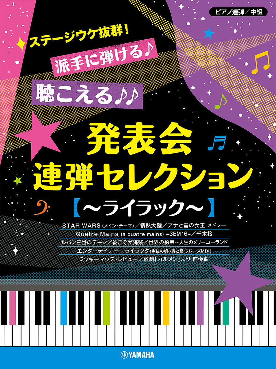 発表会やイベントのステージ演奏に役立つ1冊!幅広い年令層にウケる名曲・注目曲の聴き映えするアレンジが揃っています。新しくアレンジした、大人気Mrs. GREEN APPLEの「ライラック」は、「点描の唄」「青と夏」のフレーズを取り入れた、豪華連弾バージョンでお届けいたします♪その他にも映画『スター・ウォーズ』のメイン・テーマや、『アナと雪の女王』の人気曲をコンパクトにまとめた欲張りなメドレー、若者に大人気の「千本桜」、映画『ヱヴァンゲリヲン新劇場版:Q』の連弾シーンで注目された、小気味良いクラシック調の「Quatre Mains」、老若男女が知るところの「ルパン三世のテーマ」「情熱大陸」etc. 連弾ならではの華やかな演奏でおおいに盛り上がること受けあいです。※本書は、「ピアノ連弾 ステージウケ抜群!派手に弾ける♪聴こえる♪♪発表会連弾セレクション〜情熱大陸〜(GTP01098019)」より、権利の都合上収載曲を一部差し替えた改訂版です(「JAZZメドレー」を「ライラック(点描の唄〜青と夏 フレーズMIX)」へ変更いたしました)。