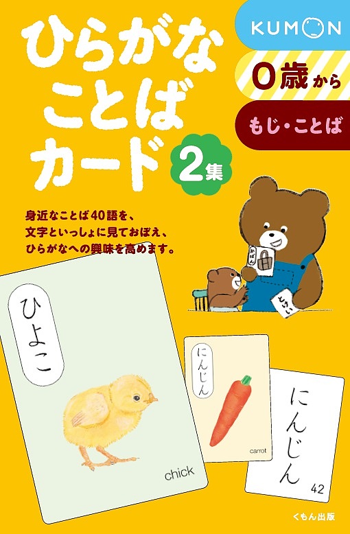 小さなお子さまの身のまわりにある親しみやすいことばを中心に「ひらがなことば」40語を収録。カード表面には「ひらがなことばがあらわすイメージのイラスト」と「ひらがなことば」を掲載。裏面には「ひらがなことば」のみを掲載しています。
