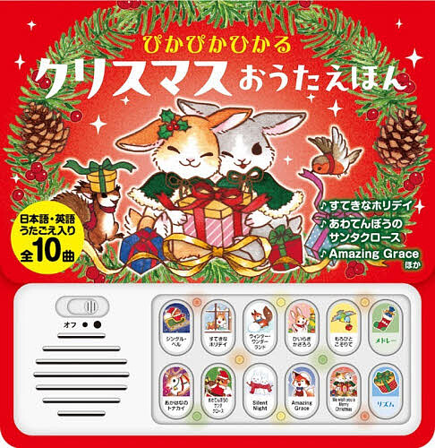 クリスマスが近づいてくるあのワクワク感を、音と光で親子で一緒に楽しめるクリスマスギフトにぴったりのおうた絵本です。収録曲は全10曲。音に合わせてぴかぴか光る本体モジュールと、楽しい効果音ボタン・メドレーボタン付き。