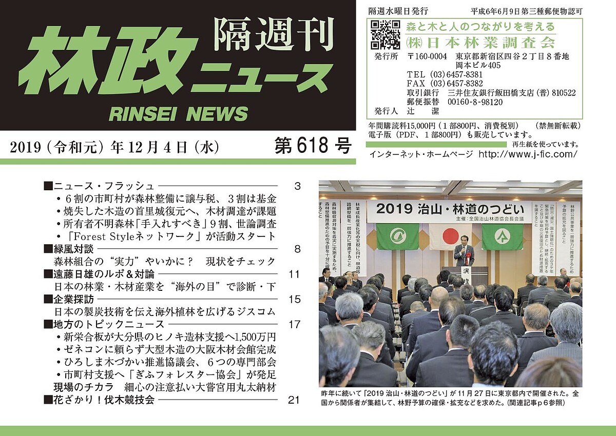 第618号は、約6割の市町村が譲与税を森林整備に活用/首里城復元への課題は木材調達/製炭技術を伝え海外植林を広げるジスコム/新栄合板が大分県のヒノキ造林支援へ1500万円寄付/鳥取県をはじめ全国各地で伐木競技会開催──などを掲載しています。