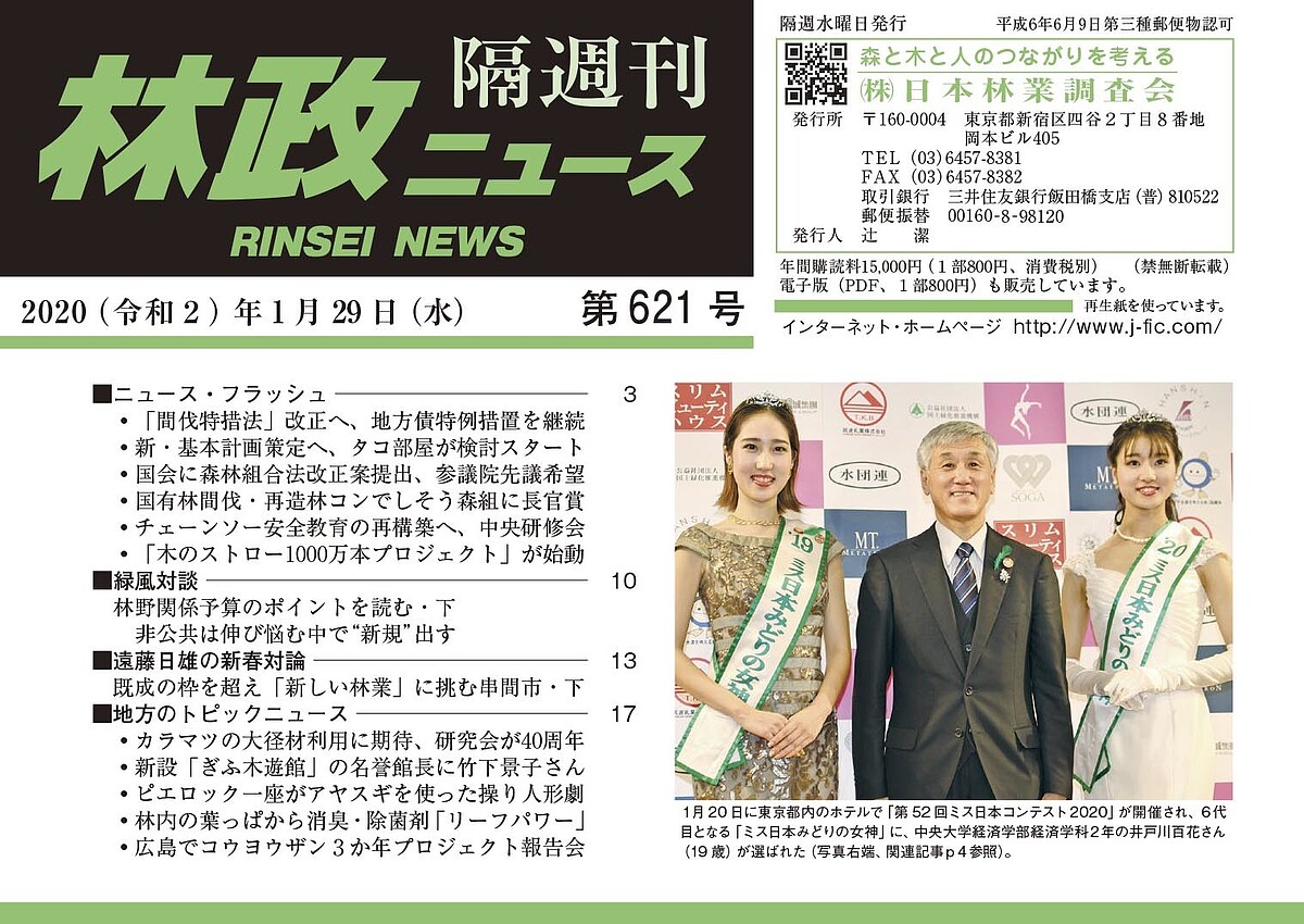 第621号は、間伐特措法を改正し地方債特例措置継続/第6代「みどりの女神」に中大生の井戸川百花さん/アキュラホームが「木のストロー1,000万本プロジェクト」/カラマツの大径材利用に期待大・研究会40周年シンポ/“木育”の新拠点「ぎふ木遊館」の名誉館長に竹下景子さん――などを掲載しています。