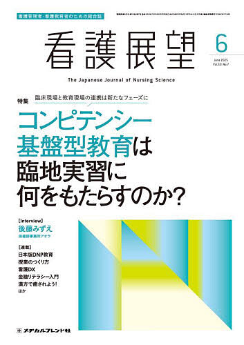 Interview 後藤みずえ 多様な肩書のベースにあるのは「看護の力」;;□特集 コンピテンシー基盤型教育は臨地実習に何をもたらすのか?;PART 1 総論 コンピテンシー基盤型教育による看護実践能力の保証の実現に向けて―臨地実習への貢献/西村礼子;PART 2 コンピテンシー基盤教育に基づく看護基礎教育と臨床教育の再構成 ケアリングの視点が築く看護基礎教育と臨床教育の関係性/佐藤聖一;PART 3 実習病棟の看護管理者・リーダーに求められるマネジメント コンピテンシー基盤教育の実現で求められる安全と学びの両立に向けたアプローチ;;□管理 ●Nバク流 課題を力に変えるヒント(6)こんな師長のもとではやっていけない―新任師長の存在に揺れるチームと副師長の立ち位置/Nバク ●看護師の倫理“観”をはぐくむ倫理研修(6)医療諸原則と症例検討4分割シート/小野原雅夫・堀川由加里・佐々木知輝 ●日本版DNP教育の現場から(1)DNP(Doctor of Nursing Practice)への扉―重要性が認識されながら、なぜ、地域と医療機関の連携は進まないのか;;□教育 ●エキスパートの思考を体感できる 授業のつくり方(5)慢性期における臨床判断・臨床推論「学生に気づきを促した思考発話の事例」〈後編〉 ●授業デザイン・授業リフレクションの実際〜臨床編〜(6)看護・介護スタッフ全員を対象にした研修会 認知症の人への夜間の不眠に対するケア ●ロジカルシンキング術(6)奇跡を運ぶ風/李 慧瑛・緒方重光 ●新カリキュラム開始から3年 看護基礎教育の進化を考察する(3)新設した「多職種連携論」の授業効果をあげるために、何をどのように伝えたのか;;●すてきな看護職(18)覚えるだけではなく、考え、判断し、行動できる看護師を育てる;●イベント報告「Nurse for Nurse」主催、メヂカルフレンド社共催で、ウェビナーを開催―「看護のリーダーシップ『看護エキスパート』から学ぶ」;●看護DX〜未来のケアを見据えた業務改革〜(6)看護記録が変わるから、看護が変わる;●金融リテラシー入門(6)年金制度をもっと知ろう(2)―年金制度の課題と改革;●漢方で癒されよう!(6)便秘解消と胃腸の健康をサポートする漢方;●こころをみつめるVol.210 稲田俊輔 著『ミニマル料理―最小限の材料で最大のおいしさを手に入れる現代のレシピ85』;;