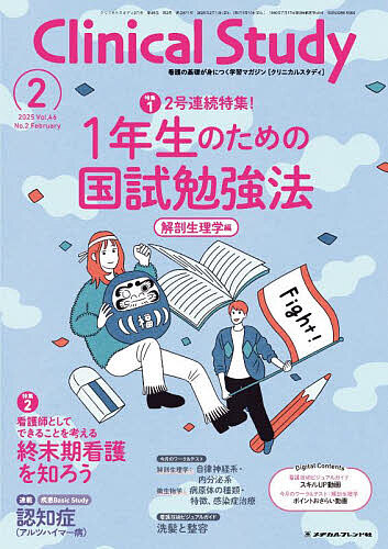 特集12号連続特集!1年生のための国試勉強法〜解剖生理学編〜〔執筆〕金澤 美樹2年生から実習が本格的に始まり忙しくなる前に国試対策を始めることは重要です。本特集では、1年生からできる国試に向けた勉強法を紹介します。今から少しずつ国試勉強を進めて、同級生に差をつけましょう!特集2看護師としてできることを考える終末期看護を知ろう〔執筆〕後閑 愛実患者さんの命との向き合い方について、考えたことはありますか? 今後、臨地実習や臨床で働くなかで、患者さんの終末期や最期と向き合う機会があるかもしれません。本特集で、看護師として終末期の患者さんにできることを考えてみましょう。3STEPで学ぶ!疾患Basic Study認知症(アルツハイマー病)〔監修〕畑中 あかね、船木 淳〔執筆〕秋定 真有実習や国試で出合うことの多い疾患の解剖から治療、看護までをやさしく解説します。連 載●看護師の職場に密着! 未来の“あなた”をみてみよう●看護技術ビジュアルガイド/執筆:石塚 睦子 撮影協力:正藤 倫音 洗髪と整容●今月のワーク&テスト【解剖生理学】/高野 海哉 自律神経系・内分泌系【微生物学】/小野木 弘志 病原体の種類・特徴、感染症治療●国試PERFECT STAGE/フラピエ かおり●○○ってどんな仕事? 医療を支える職種を知ろう/古長 治基 公認心理師●基礎力アップドリル【数学】/監修:小川圭子 執筆:末武 友紀子 圧力3(酸素ボンベの使用可能時間)【国語】/浅川 翔子 医療関連用語8、文脈読解5 ●TOPICS&プレゼント連 載●看護師の職場に密着! 未来の“あなた”をみてみよう●看護技術ビジュアルガイド/執筆:石塚 睦子 撮影協力:正藤 倫音 洗髪と整容●今月のワーク&テスト【解剖生理学】/高野 海哉 自律神経系・内分泌系【微生物学】/小野木 弘志 病原体の種類・特徴、感染症治療