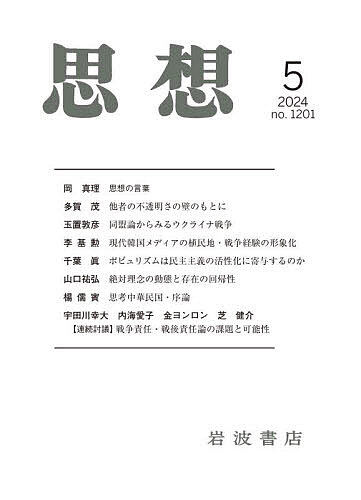思想の言葉 岡 真理他者の不透明さの壁のもとに──ジャン・ウリ没後10年に寄せて 多賀 茂同盟論からみるウクライナ戦争 玉置敦彦現代韓国メディアの植民地・戦争経験の形象化──映画・ドラマを中心に 李基勲/盧ジュウン訳ポピュリズムは民主主義の活性化に寄与するのか 千葉 眞絶対理念の動態と存在の回帰性──ヘーゲルの理念論 山口祐弘思考中華民国・序論──原点から出発する思考(中) 楊儒賓/丸川哲史訳〈連続討議〉戦争責任・戦後責任論の課題と可能性(中) 宇田川幸大・内海愛子・金ヨンロン・芝 健介