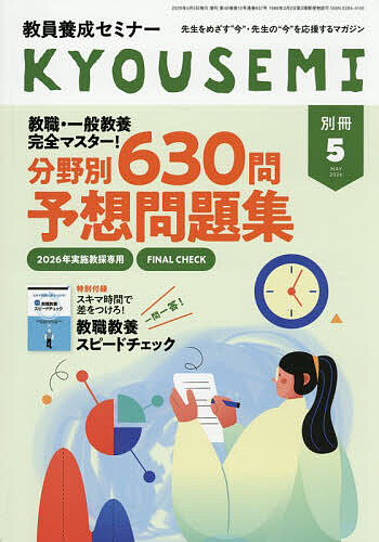 2026年5月号別冊は,「初等中等教育段階における生成AIの利活用に関するガイドライン」など,最新の教育時事(答申・資料等)を網羅! 『KYOUSEMI』編集部が教職・一般教養の出題傾向を徹底的に分析し,2026年実施教員採用試験で出題が予想される問題を,分野別に計630問掲載しています。また,各トビラに掲載している「正誤判定チェックシート」によって,自分の得意・不得意分野を把握することも叶います。問題は分野別になっているため,それによって分かった不得意分野を徹底演習することもできます。試験直前期の力試し,弱点克服はもちろん,新大学2〜3年生の皆さんが自分の弱点を知るためにもぴったりの1冊です。ブックインブック「一問一答! 教職教養スピードチェック」では,教育原理・教育心理・教育史・教育法規の頻出事項を一問一答形式で確認することができます。スキマ時間の勉強におすすめです。