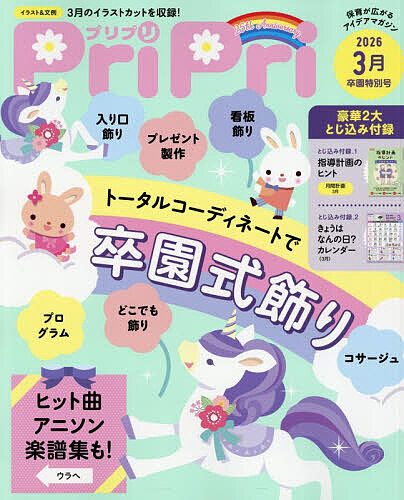 卒園式を鮮やかに彩ります! 3月の指導計画・イラストカット・文例も収録・保育の“困った”を解決する味方の一冊!・製作アイデアから保育の最新情報まで満載! 0・1・2歳児の保育も充実!・毎号人気の付録【月間指導計画】【切ってすぐ使えるシアターキット】・保育の現場で役立つ&【きょうはなんのひ? カレンダー】【とじ込み付録】きょうはなんのひ? カレンダー指導計画のヒント(3月)卒園式会場飾り トータルコーディネートアイデア集入り口飾り、看板飾り、窓飾り、コサージュ、プログラムなどを統一コーディネートありがとうを伝える 卒園プレゼントダウンロードで作る! 卒園プログラムアニソン卒園楽譜集 生きてこそ 夢をかなえてドラえもん 勇気100% やさしさに包まれたなら 乙女のポリシー キミに100パーセント Together 虹 ありがとうがいっぱい 1・2・3