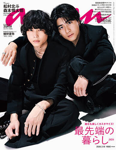 松村北斗森本慎太郎(SixTONES)対極の信頼関係。進化も楽しくカスタマイズ!最先端の暮らし2026暮らしを上手にアップデート。最先端の家電Wish ListGeminiやChatGPT、どう使ってる?生成AIともっと仲良くなる方法。最先端の「かわいい相棒」がいる日常。「AIペットのいる暮らし」体験レポート。カフェ、イベント、クリーニング…+αが充実!進化するコインランドリー。多機能イヤホン、スペパ家具、代替カカオ…最先端の暮らしNews“いざというとき”は突然やってくる。身近なことから始める防災手帖。配信記念SPアニメ『スティール・ボール・ランジョジョの奇妙な冒険』新たなる運命の序章今の時代の心地よい最適解って?私たちの毎日を快適にする優しいフェムケア。快適な暮らしへと導くケアアイテム。CLOSE UP3SKM夜行性の衝動。短期集中連載舞台『AmberS −アンバース−』をめぐる世界。AmberS Universe vol.2猪狩蒼弥「果敢」な解放。