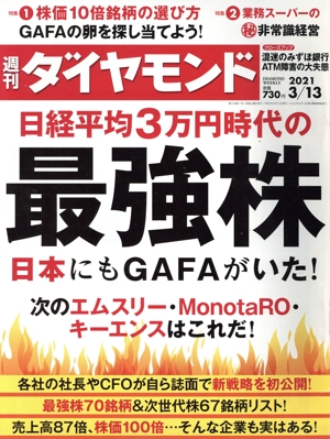 【特集】●日経平均3万円時代の最強株◇Part1 日本にもGAFAの卵はあった!成長株に投資しよう!◎最強のテンバガーを狙い撃て◎株価勝者「三つの条件」とは?◎Interview 岩谷渉平 アセットマネジメントOneファンドマネジャー◇Part2 エムスリー、MonotaRO、キーエンス… 最強株を徹底解剖!◎最強株 エムスリー、MonotaRO、GMOペイメントゲートウェイ、キーエンス、野村総合研究所、オープンハウス、eBASE、アバント、Sansan、ベネフィット・ワン、日本M&Aセンター、レーザーテック◎Interview◇此本臣吾 野村総合研究所会長兼社長◇白石徳生 ベネフィット・ワン代表取締役社長◇三宅卓 日本M&Aセンター代表取締役社長◇Part3 将来性抜群の若い企業が勢ぞろい 5年後のテンバガーを探せ!◎次世代スター候補20を発表◎成長の率と質で選ぶ最強株◎各市場に特大ポテンシャル/【特集2】●「業務スーパー」の非常識経営/【Close Up】◆みずほで「3度目」のシステム障害 新頭取を待つ笑顔なき船出/◆「前田」の名を看板から消す覚悟も 前田建設、親子げんかの顛末/◆コロナで需要蒸発、10分の1以下 インフル薬シェア争いが激変/…ほか