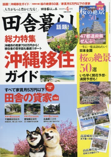 沖縄で暮らそう|別添:小冊子(桜の絶景フォトブック) 綴込:小冊子 ★別冊付録 ・一生に一度は訪ねたい! 日本全国桜の絶景50選☆綴じ込み付録 ・全国の賃貸物件を一挙公開! 5万円以下の田舎の貸家152[特集]●沖縄市の売家700万円から! 移住者が語る苦労話も徹底リポート 話題!沖縄移住ガイド ◇沖縄エリアガイド ◇イラストレーター トキシンの沖縄生活 ◇移住者&地元住民リポート[読谷村] 都会でもない、田舎でもない。 移住者が集まる「大きな村」の暮らし ◇移住者リポート[那覇市] 高校教師から珈琲店のオーナーへ 那覇で始めた50歳からの新しい人生 ◇大人気Webサイト「沖縄移住ライフハック」 みなみの家が紹介する沖縄移住事始め ◇移住体験ツアーリポート[粟国村] 本島から粟国島へ2段階移住!? 等身大の離島生活を体感 ◇ピックアップ物件 ◇不動産業者が紹介する沖縄物件26 ◇沖縄移住サポート情報◆DIYに便利!非常時も安心! 田舎暮らしでは発電機が大活躍!◆残材を燃やして地域を元気にするスゴイしくみ◆親子でチャレンジ!!田舎留学◆宮崎・鹿児島 九州南部で二世帯移住◆田舎不動産現地調査リポート 長野県南信エリア 駒ヶ根市・宮田村周辺…ほか