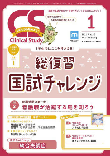 特集1 2号連続特集〜前編〜1年生ではここを押さえる!総復習 国試チャレンジ〔執筆〕清水 泰子学年末を控え、進級の準備が重要な時期になりました。本特集では、1年生のまとめとして押さえたいポイントを、国試問題を活用して総復習! 今から少しずつ1年間の振り返りを進めて、同級生に差をつけましょう!特集2就職活動の第一歩!看護職が活躍する場を知ろう〔編集・執筆〕勝眞 久美子1年生のうちから将来について具体的にイメージするのは難しいですよね。本特集では、看護師が活躍している場の特徴から情報収集のコツまで、就職活動の気になるポイントを詳しく紹介します。 “就活”の第一歩を踏み出してみましょう!3STEPで学ぶ!疾患Basic Study統合失調症〔監修〕畑中 あかね、船木 淳〔執筆〕奥田 淳実習や国試で出合うことの多い疾患の解剖から治療、看護までをやさしく解説します。連 載●看護技術ビジュアルガイド/執筆:石塚 睦子 撮影協力:正藤 倫音、田中 陽子 陰部洗浄とおむつ交換●今月のワーク&テスト【解剖生理学】/高野 海哉 感覚器系【薬理学】/小野木 弘志 糖尿病治療薬、消化器系作用薬●国試PERFECT STAGE/フラピエ かおり●看護学生のメンタルサポート/谷原 弘之 あなたの新年の目標は何ですか?●基礎力アップドリル【数学】/小川 圭子 圧力2(酸素残量)【国語】/藤井 知弘 医療関連用語10、文脈読解6 ●TOPICS&今月のプレゼント