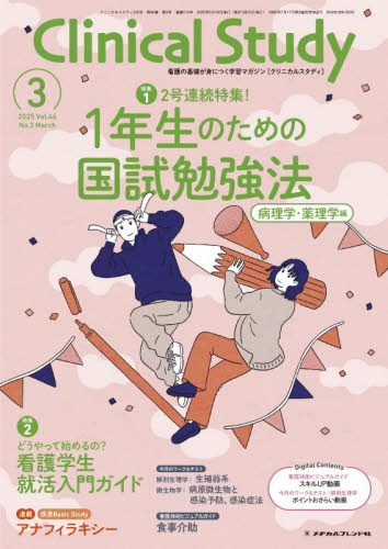 特集12号連続特集!1年生のための国試勉強法〜病理学・薬理学編〜〔執筆〕金澤 美樹2号連続特集の後編です。本特集では、2月号で解説した解剖生理学の勉強法に加え、病理学・薬理学での1年生からできる国試に向けた勉強法を紹介します。今から少しずつ国試勉強を進めて、同級生に差をつけましょう!特集2どうやって始めるの?看護学生 就活入門ガイド〔執筆〕小池 武嗣1年生のうちから就活について具体的にイメージするのは難しいですよね。本特集では、就活の流れから情報収集のコツ、さらには様々な看護師の働き方を紹介します。“就活”の第一歩を踏み出してみましょう!3STEPで学ぶ!疾患Basic Studyアナフィラキシー〔監修〕船木 淳、畑中 あかね〔執筆〕瀧澤 紘輝実習や国試で出合うことの多い疾患の解剖から治療、看護までをやさしく解説します。連 載●実習 STORY FILE 静岡医療センター附属静岡看護学校●看護技術ビジュアルガイド/執筆:石塚 睦子 撮影協力:正藤 倫音 食事介助●今月のワーク&テスト【解剖生理学】/高野 海哉 生殖器系【微生物学】/小野木 弘志 病原微生物と感染予防、感染症法●国試PERFECT STAGE/フラピエ かおり●〇〇ってどんな仕事? 医療を支える職種を知ろう/辻? 志帆 介護福祉士●基礎力アップドリル【数学】/小川圭子 応用問題(滴下数)【国語】/浅川 翔子 医療関連用語8、文脈読解6 ●TOPICS&プレゼント