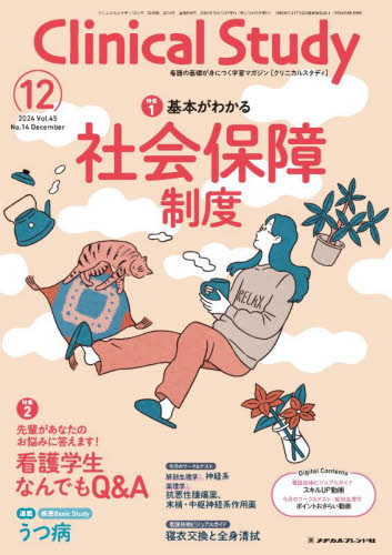 特集1基本がわかる社会保障制度〔執筆〕大西 昭子社会保障制度は難しい単語が多く、しくみも複雑で苦手になりやすい分野です。本特集では、そんな社会保障制度の基礎をイラストでわかりやすく解説し、さらに社会保障制度を利用する患者さんの事例も紹介します!特集2先輩があなたのお悩みに答えます!看護学生なんでもQ&A〔編集〕『Clinical Study』編集室〔協力〕公益社団法人藤沢市医師会 湘南看護専門学校、JA茨城県厚生農業協同組合連合会 土浦協同病院附属看護専門学校進級が近づき、2年生からの実習や勉強が不安……と思うことはありませんか? 本特集では、1年生の皆さんが抱えるお悩みについて、先輩からのアドバイスを紹介します! 今後の学校生活の悩みを解消しましょう!3STEPで学ぶ!疾患Basic Studyうつ病〔監修〕畑中 あかね、船木 淳〔執筆〕奥田 淳実習や国試で出合うことの多い疾患の解剖から治療、看護までをやさしく解説します。連載●実習 STORY FILE 天草市立本渡看護専門学校●看護技術ビジュアルガイド/執筆:石塚 睦子 撮影協力:正藤 倫音、田辺 洋子 寝衣交換と全身清拭●今月のワーク&テスト【解剖生理学】/高野 海哉 神経系【薬理学】/小野木 弘志 抗悪性腫瘍薬、末梢・中枢神経系作用薬●国試PERFECT STAGE/フラピエ かおり●○○ってどんな仕事? 医療を支える職種を知ろう/小谷 鷹哉、藤井 奏栄、秩父 里帆 柔道整復師●基礎力アップドリル【数学】/監修:小川圭子 執筆:末武 友紀子 圧力1(基礎知識)【国語】/品川 なぎさ 医療関連用語6、長文読解9 ●TOPICS&プレゼント