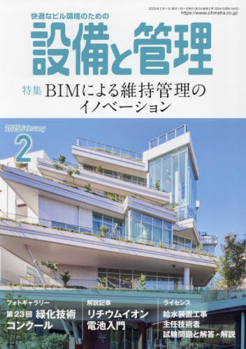 特集 BIMによる維持管理のイノベーション解説 リチウムイオン電池入門ライセンス 給水装置工事主任技術者 試験問題と解答・解説連載 現場ではたらくビル管INTERVIEW/事例に学ぶ設備お悩み相談室/完全図解 品質管理・QC手法の基礎知識/マンションを100年持たせる再生シナリオ(実践編)/Excelを使いこなすためのワンポイント/