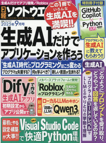 生成AIでWebサービスを作ろう/ローカルAIで文字起こしアプリを作る|別添:小冊子「GitHub Copilot×Python入門 ダイジェスト版」 【特別付録】・GitHub Copilot×Python入門 ダイジェスト版【特集】・生成AI時代のプログラミングを考えながら Geminiを利用 生成AIだけでWebアプリを作ろう・生成AIはどのようにプロンプトを受け取り、 どうやって回答を返しているのか?・Difyで作る生成AIアプリ 環境設定から、初めての生成AIアプリ開発まで・Visual Studio Codeで 「快適Python開発環境」を構築!・Roblox プログラミング入門 前編…ほか