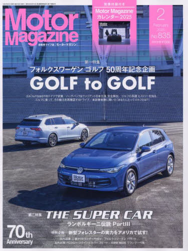 『フォルクスワーゲンゴルフ50周年記念企画 GOLF to GOLF』|別添:「Motor Magazine特製2025カレンダー」 2025年2月号の第一特集はフォルクスワーゲン ゴルフ50周年記念企画「GOLF to GOLF」。まもなく日本で発表される新型ゴルフ8.5。ひと足先に行ったドイツ本国での試乗から日本仕様の徹底詳解、そしてヒストリーを振り返るなどゴルフ尽くしの企画です。第二特集は「THE SUPER CAR ランボルギーニ伝説 PartIII」。日本でも発表がされたテメラリオの詳細や、中国・内モンゴルで行われた雪上試乗のレポートをお届けします。このほか、SUBARU新型フォレスターの実力をアメリカで試す特別企画など、多岐に富んだ自動車情報をお伝えします。《 別冊付録 》『Motor Magazine 2025 ORIGINAL CALENDER』《 目次 》【 第一特集 】フォルクスワーゲン ゴルフ50周年特別企画『GOLF to GOLF』Part1−1 ドイツ・ウォルフスブルグで先行試乗Part1−2 本国プロダクトマーケティングマネージャーに聞くPart2 ハッチバック&ヴァリアント日本仕様 完全解剖Part3 GOLFの系譜と積み重ねた歴史を知るPart4 世代を超えて伝わる“本質”Part5 Motor Magazine 筆者陣に聞いた「あなたとゴルフの思い出」【 第二特集 】『THE SUPER CAR ランボルギーニ伝説 Part III 』Part1 ランボルギーニ テメラリオ 国内初披露Part2 雪上イベントPart3 新ファクトリーツアー【 特別企画 】◎ ヒョンデの今と未来Part1 新型電気自動車 インスターに韓国で試乗Part2 ヒョンデN×トヨタGRレーシング フェスティバルPart3 次世代の燃料電池車 イニシウムを発表◎ SUBARU 新型フォレスターの実力をアメリカの大地で試す!【 Front Talk 】◯ 木村好宏の “耳寄りな話”◯ あえてクルマで行きたい場所◯ 五十嵐 誠の “クルマ道楽に贈る 極楽ゴルフ情報”【 THE TOP NEWS 】・ベントレー フライングスパー スピード 海外試乗・BMW M235 xDrive グランクーペ 海外試乗【 連載 】◯ S…他