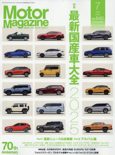 『最新国産車大全2025』/『ジャーマン・テック最前線』/『インポートEVのいま』| 2025年7月号の大特集は「最新国産車大全2025」。パート1では最新国産車のニュースや試乗の模様をお届けします。パート2では現在販売される国産モデルをアルバム形式でご紹介します。またモータージャーナリストによるおすすめグレードも必見です。このほか特別企画「Sの称号が示す、孤高の性能 SUBARU S210試乗」や「フォルクスワーゲン TDIモデル燃費チャレンジ&フォトコンテストに挑戦」など、バラエティに富んだ自動車情報をお伝えします。《 目次 》【 Front Talk 】◯ 木村好宏の “耳寄りな話”「カーデザインイベント クルマのデザインを語ろう!」◯ あえてクルマで行きたい場所「別邸 仙寿庵 / 群馬県利根郡」◯ 五十嵐 誠の “クルマ道楽に贈る 極楽ゴルフ情報”「 “オンリーワン” を手に入れる」【 特集 】『最新国産車大全 2025』PROLOGUE 国産ブランドの現在地と、これからの挑戦Part 1 最新国産モデルニュース&試乗◯ 新型車情報・トヨタ RAV4・レクサス ES・日産 パトロール(中東仕様)/ キャシュカイ(欧州仕様)・ホンダ ステップワゴン◯ 新型車試乗・スバル フォレスター・三菱 アウトランダーPHEV/マツダ CX−80/スズキ ソリオ バンディット/ダイハツ コペンPart 2 国産モデルアルバム・トヨタ ・GR ・レクサス ・日産 ・ホンダ ・三菱 ・マツダ ・スバル ・スズキ ・ダイハツ ・光岡◯ コラム・1「レーシングカーに求められる精度を実現するGR」・2「レクサススポーツモデルの現状を整理」・3「NISMOとAUTECHの違いとラインナップ」・4「ホンダの電動化戦略 2025 ビジネスアップデート」・5「マツダの次なるパワーユニット戦略」・6「SUBARU渾身の “S:HEV” が秘めた可能性」・7「国産OEMモデルの事情と最新ラインナップ」【 特別企画 】◎ SUBARU S210 impression「Sの称号が示す孤高の性能」◎ フォルクスワーゲンのTDIモデルで燃費チャレンジ「長距離で発揮、ディーゼルの底力」・Tロック TDI 4モ…他