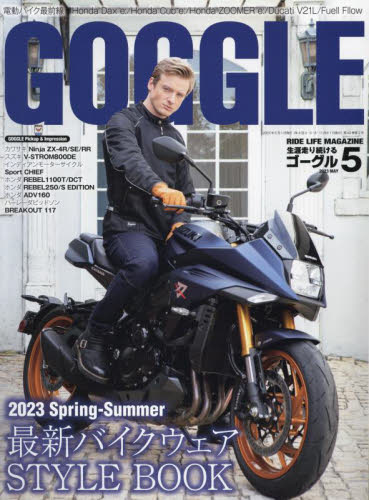 GOGGLEは ライダーのファッションを応援します| ■ EVバイクの「いま」とこれからの注目モデルを大特集! ■ ファッショナブルなモデルとシックなカラーのKATANAが表紙を飾る5月号。EVバイク特集では海外で発表されたホンダの3機種をはじめ、ドゥカティのMOTO E 参戦モデルや Fuell FLLOW、BMW CE04、CAKE などの詳細をお届け。スタイルブックでは今年の春夏最新バイクウェアを特集。?????《 目次 》?????【 GOGGLE ITEM SELECTION 】「KADOYA meets 葉月美優」・ROX GLOVE / GLOVE?PL・PL?RAFF LADY・PL?SW LADY・ASH?ELEFANTAS【 特別企画 】『NINJA ZX?4R/SE/RR』?ついに降臨!! 待望の4気筒400 スーパースポーツ!・ZX?4R・ZX?4R RR・ZX?4SE【 特集 】EVはついに新世代突入する!『EVバイク最前線』・Honda Dax e: 海外モデル・Honda Cub e: 海外モデル・Honda ZOOMER e: 海外モデル・KAWASAKI NNJA BEV プロトタイプ・KAWASAKI Z BEV プロトタイプ・DUCATI V21L・Fuel FLLOW・BMW CE 04・CAKE『2023 GOGGLE SPRING & SUMMER STYLEBOOK』・Max Fritz DESIGNS・max fritz femme・DAYTONA・RIDEZ・SUGAR RIDEZ【 連載 】◆ GOGGLE VIEW1. ASTRO・GXスパイン/VZ?RAM ナカガミGP2「アライから新製品が発売」◆ GOGGLE Impression・SUZUKI V?STROM 800DE・Indian MotorCycle Sport CHIEF・Indian MotorCycle ESCOUT ROGUE・HONDA REBEL 1100T/DCT・HONDA REBEL 250 / S EDITION・HARLEY?DAVIDSON BREAKOUT 117