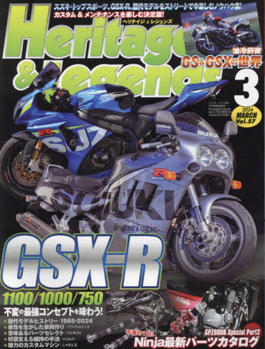 「Heritage & Legends Vol.57」『GSX−Rスペシャル』| ■ 巻頭特集は『GSX−R スペシャル』です! ■ 1985年に油冷GSX−R750がデビューして以来、連綿と現在まで紡がれるスズキ・スーパースポーツの最高峰、GSX−R 1100/1000/750シリーズ。初代油冷機から最新の水冷機まで、各世代モデルのカスタム&メンテナンスのツボを、それぞれに長けたプロショップに取材。各車のオーナーにはもちろん、歴代GSX−Rにこれからアプローチしたいライダーにも購入のヒントとなる内容です。 そのほか特別企画として、巻頭特集を受け、油冷機前夜の AMA Superbike & Endurance における活躍を通して見た“SUZUKI GS & GSX の世界”のほか、前号の大特集“GPZ900R Ninja Special!”のパート2もお届けします。【 H&L TOPIC 】スズキ2024ブランニュー2モデルが国内発進!「GSX−S1000GX & GSX−8R」【 特集 】『SUZUKI GSX−R 1100/1000/750』〜不変の最強コンセプトを味わう!◯ GSX−R History「グランプリスペックを市販車に投影するトップパフォーマー・40年の歴史を見る」◯ TECHS to MAINTAIN the GSX−R「歴代各モデルの魅力を確実に引き出す手法」・BRIGHT LOGIC・TECHNICAL GARAGE RUN・m−tech・SHABON−DAMA【 特別企画 】◎ 油冷機前夜『SUZUKI GS & GSX の世界』・AMA Superbike & Endurance◎ CONVERSATION ON THE 40TH ANNIVERSARY OF NINJA DEBUT『GPZ900R Ninja Special! Part 2』・著名コンストラクターに聞く “過去・現在・未来” Part 2・GPZ900R パーツカタログ【 H&L Special Column 】◆ 吉村政誠也がふたたび工具を手に2ストレーサーをレストアする「クランクケースの組み立て (1)横割りケースの特徴」◆ アウトライダー菅生雅文のお勧め「爽快ロード!」「壮観な…他