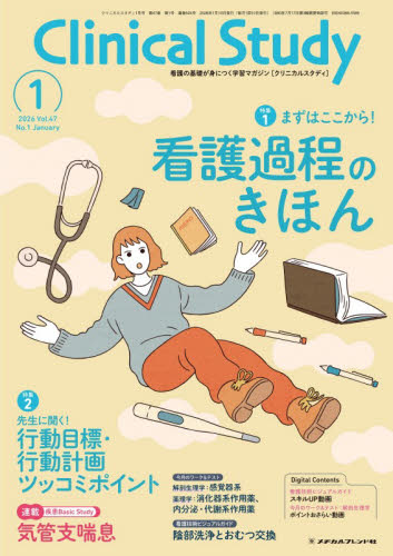 特集1まずはここから!看護過程のきほん〔執筆〕福井 里佳看護過程は看護の基盤ですが、全体像が複雑で十分に理解が進まず、難しく感じる人も多いのではないでしょうか。看護過程の全体像から各ステップの基礎的な手順とポイントを紹介していきます。特集2先生に聞く!行動目標・行動計画ツッコミポイント〔執筆〕齋藤 雪絵実習中は毎日立てる行動目標・行動計画。発表時に先生や指導者さんから指導(ツッコミ)を受けがちでニガテ……なんて人はいませんか? 本特集では、先生の目線から“ツッコミポイント”を解説していただきます!3STEPで学ぶ!疾患Basic Study気管支喘息〔監修〕船木 淳、畑中 あかね〔執筆〕橋本 侑美実習や国試で出合うことの多い疾患の解剖から治療、看護までをやさしく解説します。連 載●実習 STORY FILE 東海アクシス看護専門学校●看護技術ビジュアルガイド/執筆:石塚 睦子 撮影協力:田辺 洋子、正藤 倫音 陰部洗浄とおむつ交換●今月のワーク&テスト【解剖生理学】/高野 海哉 感覚器系【薬理学】/吉川 圭介 消化器系作用薬、内分泌・代謝系作用薬●国試PERFECT STAGE/フラピエ かおり●働く場がわかる 看護師の仕事図鑑/監修:濱田 安岐子 執筆:山下 宏美、東 紅葉、渡邉 凪沙 訪問看護●基礎力アップドリル【数学】/監修:小川 圭子 執筆:末武 友紀子 酸素ボンベ1【国語】/浅川 翔子 医療関連用語7、文脈読解4 ●TOPICS&プレゼント