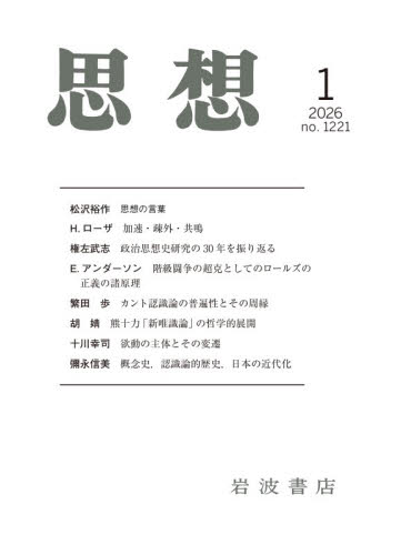 思想の言葉……松沢裕作加速・疎外・共鳴──近代に関する新しい批判理論……ハルトムート・ローザ/出口剛司 訳政治思想史研究の30年を振り返る──共和主義史観・作為の論理・解釈学・歴史哲学……権左武志階級闘争の超克としてのロールズの正義の諸原理……エリザベス・アンダーソン/奥田淳平訳カント認識論の普遍性とその周縁──視覚障害の事例をめぐって……繁田 歩熊十力「新唯識論」の哲学的展開──主客対立をめぐる現代新儒家からの応答……胡欲動の主体とその変遷──リズムの精神分析(4)……十川幸司概念史,認識論的歴史,日本の近代化──世界の近代化と前近代世界の概念体系(5):「宗教」概念の成立と展開……彌永信美