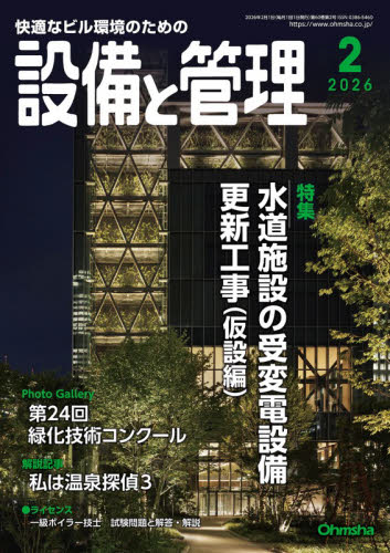 特集 水道施設の受変電設備更新工事(仮設編)解説 私は温泉探偵3 ライセンス 一級ボイラー技士 試験問題と解答・解説連載 現場ではたらくビル管INTERVIEW/マンションを100年持たせる再生シナリオ(実践編)/Excelを使いこなすためのワンポイント/自家用電気設備 マンガでわかる実務入門