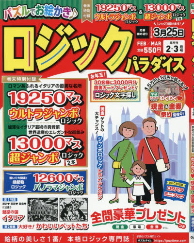 |綴込:小冊子 ルールに従ってマス目を塗りつぶすと絵が浮き上がるイラストロジックの専門誌。解きやすいミニサイズの問題から、本格派をうならせる13000マス超ジャンボ問題まで、美しい絵柄のパズルが満載! 全問豪華プレゼントつきです。