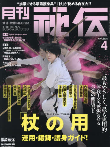 “携帯できる最強護身具”「杖」が秘める自在力| 特集◯“携帯できる最強護身具”「杖」が秘める自在力最強最後の護身武器術“杖術”とは何か?「杖」という日用品の武力、古流武術〜近代護身術「内田流短杖術」初公開、幻の杖術を求めて「茨城・田谷派無比流兵杖」、浅井星光「杖術の魅力と工夫」、etc.特別対談◯加藤久弦(靭トレ創始者)×中島翔哉(プロサッカー選手)靭トレ式「蹴球力」ハイパフォーマンス術!連載◯運動科学総合研究所・高岡英夫 武術の科学がスポーツの超進化を生む連載◯作家・増田俊也「秘話、七帝柔道記」北海道大学柔道部の日々連載◯日野晃:武道者徒歩記連載◯秘伝ジャーナル