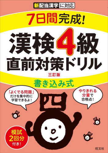 ・7日間で漢検4級の受検対策ができる、書き込み式の直前対策ドリルです。<br>・過去の検定で実際に出題された漢字の頻度を、出題分野ごとにコンピューターで分析しました。よくでる問題を収録しており、効果的な学習が可能です。<br>・改訂版では、この出題頻度データを更新し、近年よくでる問題を収録しています。<br>・自分の手で書き込みながら学習できるノート形式なので、確実に漢字の知識が身につきます。また、実際の検定問題の形式に慣れることができます。<br>・漢検は、2020年度より出題対象漢字の一部について配当級の変更をおこなっています。本書は、変更後の配当漢字に対応した問題を収録しています。<br>