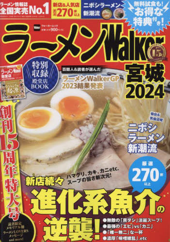 宮城でいま食べるべきラーメン満載のムックが発売! 15周年を迎える今年はお得な特典いっぱい&新店から王道店まで最旬ラーメン店を完全網羅。人気の限定麺企画はもちろん、殿堂店を総覧したメモリアル企画も!本当においしいラーメン店を厳選して紹介する「ラーメンWalker」の創刊15周年を記念した特大号。<br>タレントSPグッズプレゼントやお得な特典満載の巻頭企画に加え、過去に殿堂入りした全国86の名店を一挙に総覧できる16ページのメモリアル特集を収録。今やレジェンドとなった店主たちが「あこがれの一杯」を語る、ラーメン好きにはたまらない保存版だ。<br>新店・注目店取材では、宮城の次代を担うスーパールーキーが続々。深掘り特集では、仙台&気仙沼発「シン・ニボシラーメン」の潮流を追う。ほか、恒例の「ラーメンWalkerグランプリ」発表、エリア別に探せる大ボリュームのカタログなど盛りだくさんの内容だ。<br>